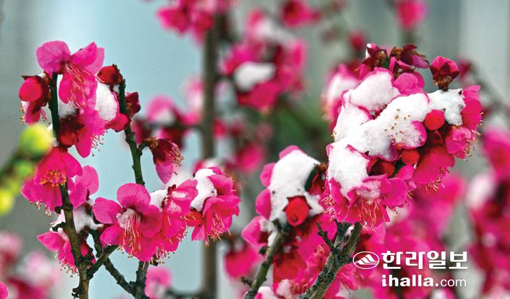 [한라일보] 8일 제주시 오라동 도로변에 핀 분홍 매화꽃에 새하얀 눈이 소복이 쌓여 한폭의 그림을 연상케 하고 있다. 강희만기자