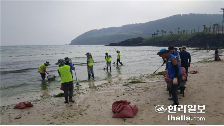 바다환경지킴이가 제주시 해안가에서 해양 쓰레기를 수거하고 있다. 제주시 제공