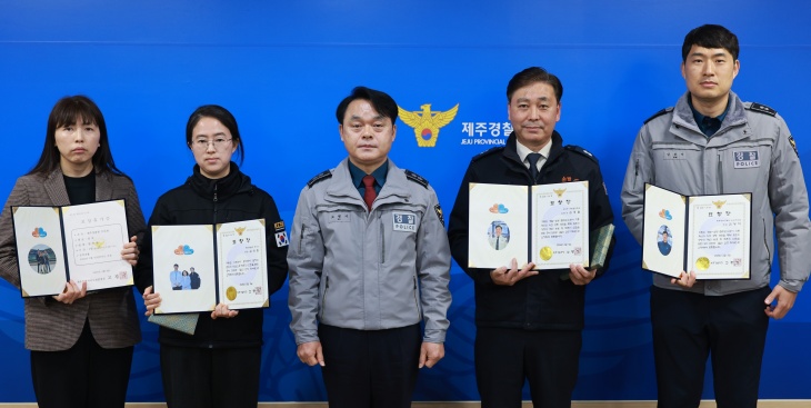 사진 왼쪽부터 양주현 경위, 김성희 경장, 고평기 제주경찰청장, 김용철 소방경, 김봉석 경감. 제주경찰청 제공