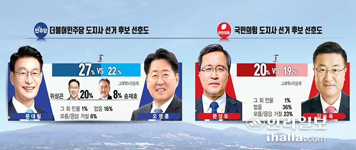 제주지사 후보 선호도 조사 결과 더불어민주당(이하 민주당) 문대림 국회의원 23%, 같은당 소속 오영훈 제주지사 20%로 양 측이 오차범위(±3.1%) 안에서 경합했다. 이어 위성곤 민주당 의원이 16%의 지지율로 바짝 추격하고 있었고, 김승욱 국민의힘 제주시 을 당협위원장은 5%, 송재호 민주당 전 국회의원은 4%, 국민의힘 소속 문성유 전 기획재정부 조정실장은 3%의 지지를 각각 얻었다. 또 김명호 진보당 제주도당위원장과 양윤녕 소나무당 제주도당위원장은 각각 1%의 지지율을 기록했다. 선호하는 인물이 없거나, 잘 모르겠다 또는 응답을 거절한 부동층은 26%다.