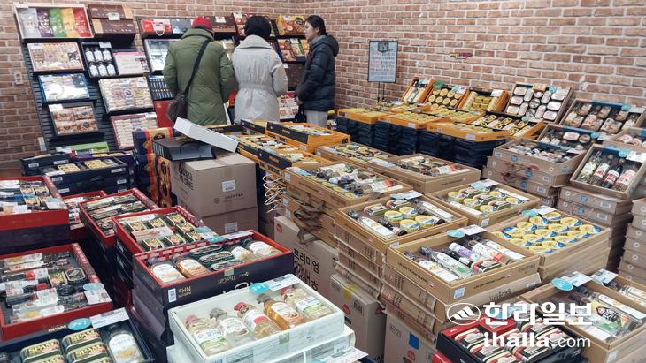 [한라일보] 설명절을 일주일여 앞둔 9일 제주시 한 대형마트에 마련된 설 선물코너에 다양한 제품이 쌓여 있다. 강희만기자