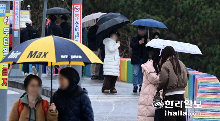 [한라일보] 매서웠던 한파가 물러나고 비가 내린 10일 제주시 도두동 해안을 찾은 관광객들이 우산을 쓰고 걸어가고 있다. 강희만기자