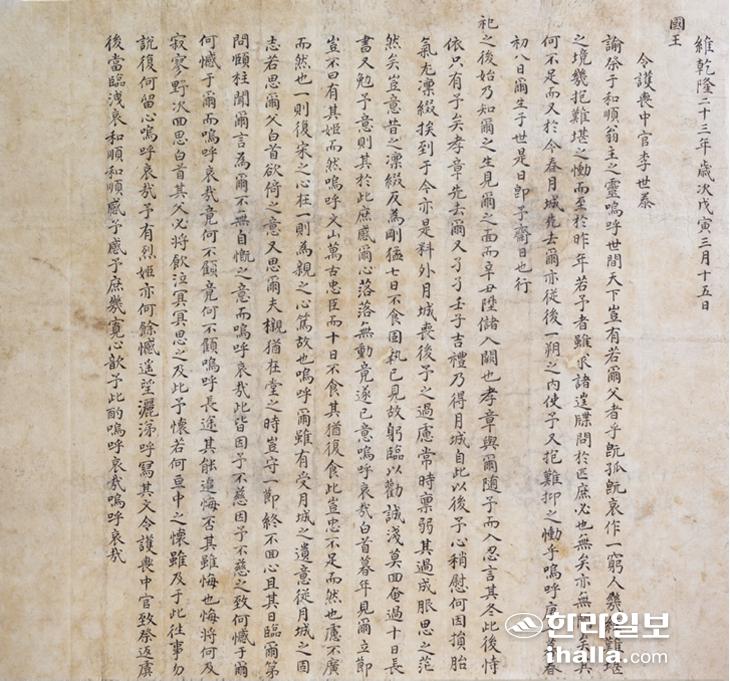 영조가 화순옹주를 애도한 '유제우화순옹주지령'.