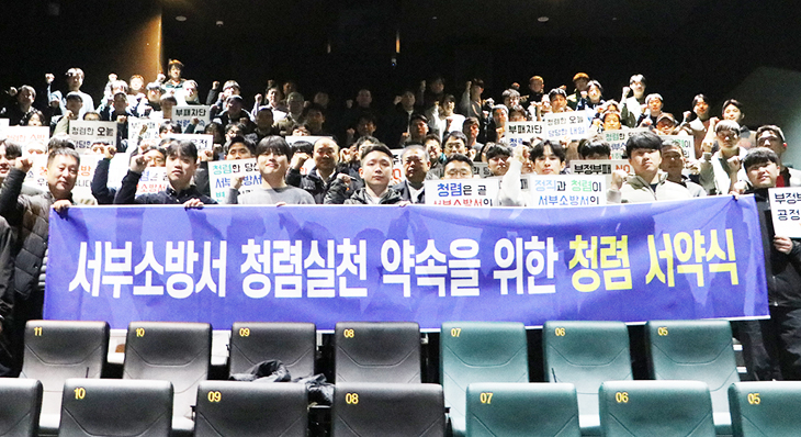 제주서부소방서(서장 고행수)는 지난 11일 롯데시네마 제주연동점에서 전 직원이 참여한 가운데 '2026년 청렴 선서식'을 시행했다. 특히 기존의 정형화된 교육 방식에서 벗어나 스트레스에 노출된 대원들을 격려하기 위한'힐링 시네마테라피'프로그램을 병행해 호응을 얻었다.