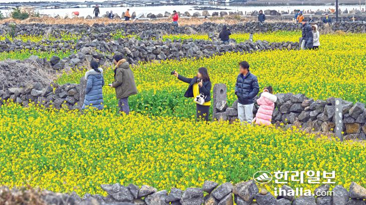 겨울 유채꽃 즐기는 관광객. 한라일보DB