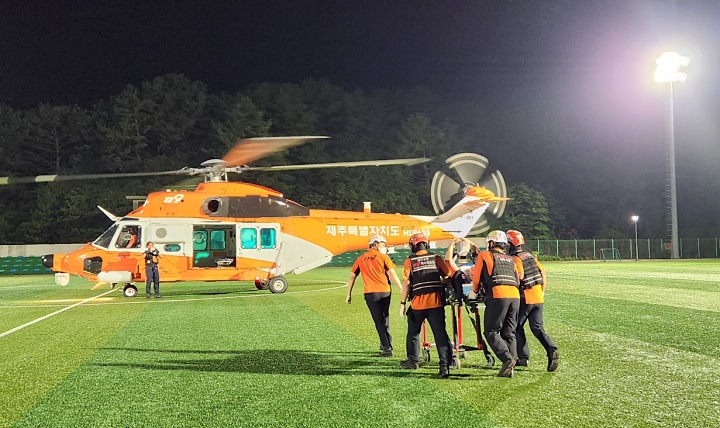 지난해 8월 6일 오후 8시 28분쯤 제주시 구좌읍 하도리의 한 축구장에서 심정지로 쓰러진 20대 남성이 소방헬기 '한라매' 투입 등 소방당국의 신속한 구조로 빠르게 의식을 회복했다. 제주소방안전본부 제공