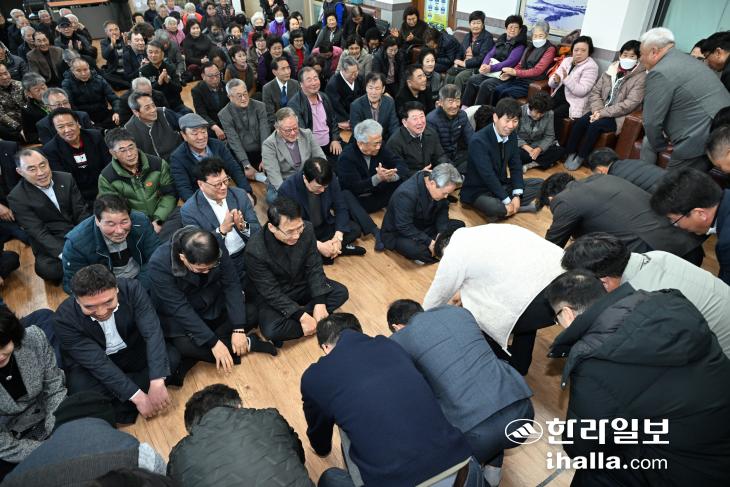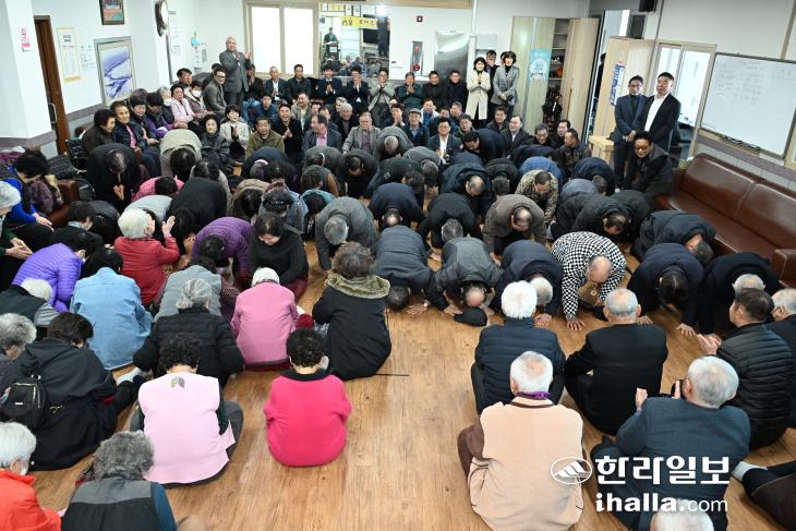 [한라일보]설 연휴 마지막 날인 18일 제주시 도두1동 마을회관에서 신년하례회가 열린 가운데 마을 주민들이 합동 세배를 하며 새해 덕담을 나누고 있다. 강희만기자