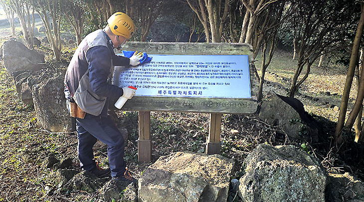 이날 목재 안내판 후면에 탈락한 목책을 고정하는 등 안전을 확보하고 잠재적 위험 요인을 제거했다. 이밖에 안내판 닦기, 출입문 잠금장치 방청 작업 등의 자연유산돌봄 일상관리 활동도 병행했다.