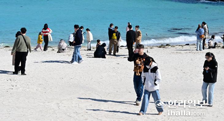 [한라일보] 19일 제주시 함덕해수욕장을 찾은 관광객들이 청정 제주 겨울바다 정취를 즐기고 있다. 강희만기자
