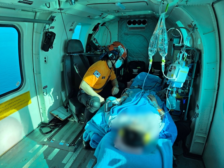 소방헬기 한라매를 이용해 도외 지역으로 옮겨지는 임신부. 제주소방안전본부 제공