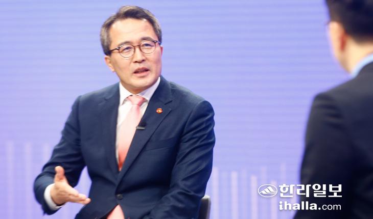제주도지사 선거에 도전하는 국민의힘 문성유 전 기획재정부 기획조정실장이 24일 KCTV 제주방송 스튜디오에서 열린 '제주도지사 선거 예비주자 특별대담'에서 발언하고 있다. 특별대담은 한라일보와 KCTV제주방송, 삼다일보, 헤드라인제주가 공동 주최했다. 공동취재단