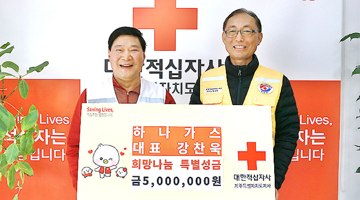 [한라일보] 강찬욱 하나가스 대표(이어도적십자봉사회 회장)는 지난 23일 지역 내 취약계층 지원을 위해 대한적십자사 제주특별자치도지사(회장 정태근)에 희망나눔 특별성금 500만원을 기탁했다.