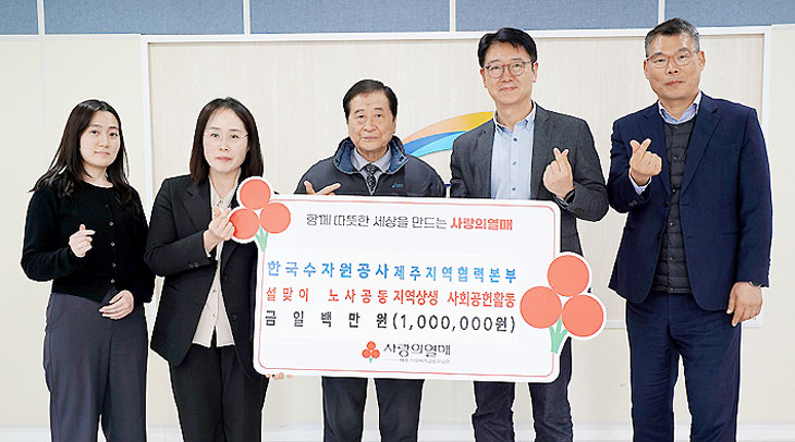 한국수자원공사 제주지역협력본부(본부장 심과학)는 최근 한국수자원공사 제주지역협력본부 대회의실에서 설 명절을 맞아 온누리상품권 100만원을 제주사회복지공동모금회(회장 강지언)에 기탁했다.