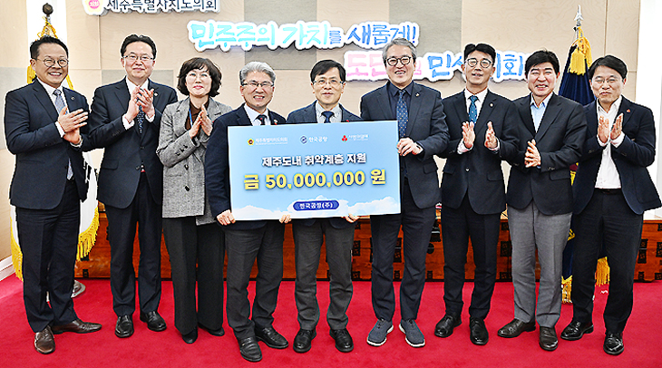 [한라일보] 한국공항(사장 이수근)은 지난 23일 제주도의회 의장실에서 강지언 제주사회복지공동모금회 회장 등이 참석한 가운데 성금 전달식을 갖고 제주사회복지 공동모금회에 5000만원을 기부했다.