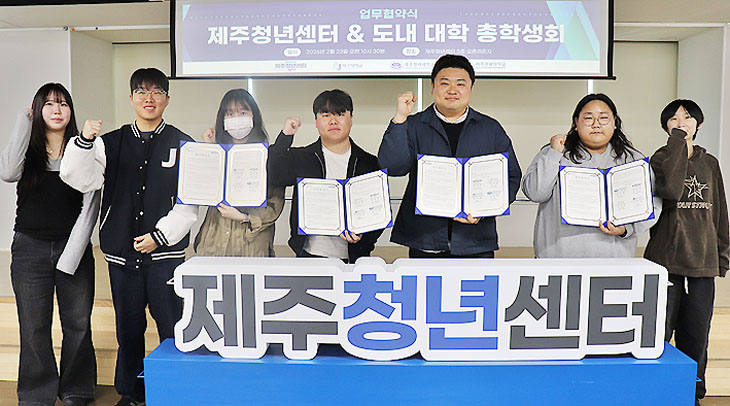 제주특별자치도와 제주청년센터(센터장 강민우)는 지난 23일 제주대총학생회(회장 양유준), 제주한라대총학생회(회장 고나윤), 제주관광대총학생회(회장 윤시현) 등 도내 대학 총학생회와 업무협약을 체결했다.