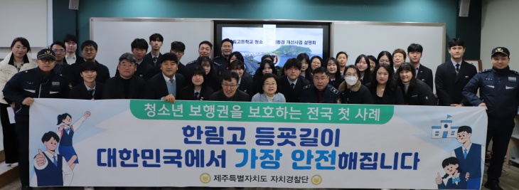 제주자치경찰단은 지난 24일 한림고에서 지역구 도의원, 한림읍장, 학부모, 재학생, 지역주민 등 50여 명이 참석한 청소년 보행환경 개선사업 설명회를 개최해 현장 의견을 수렴하고 구체적인 개선안을 마련했다. 제주자치경찰단 제공