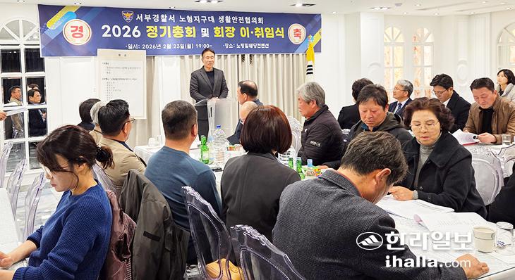 제주시 노형지구대(대장 강희용)는 지난 23일 노팅힐컨벤션에서 열린 생활안전협의회 회장 이·취임식에 참석해 지역사회 치안 협력 강화를 다짐했다.