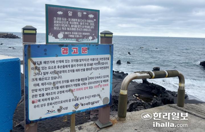 26일 오전 제주시 내도동의 알작지 해변에 돌 채취·반출 행위 단속 경고문. 양유리기자