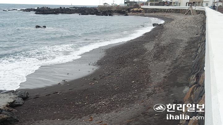 26일 오전 제주시 내도동의 알작지 해변. 몽돌 대신 검은 모래와 자갈이 가득하다. 양유리기자