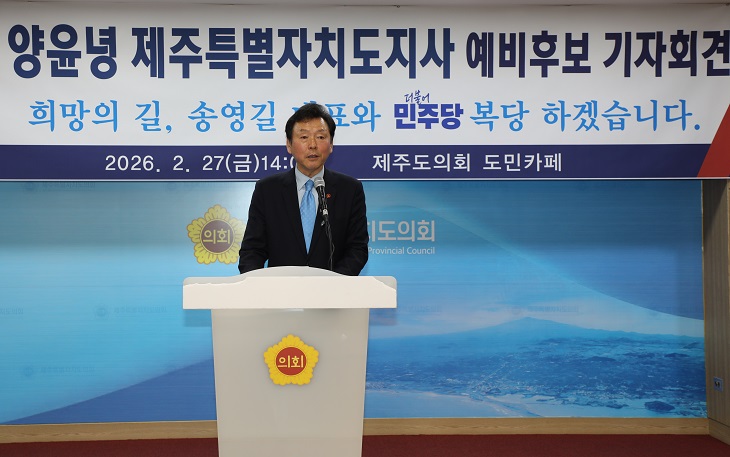 양윤녕 소나무당 제주도지자 예비후보가 27일 제주도의회 도민카페에서 기자회견을 하고 있다. 이상민 기자