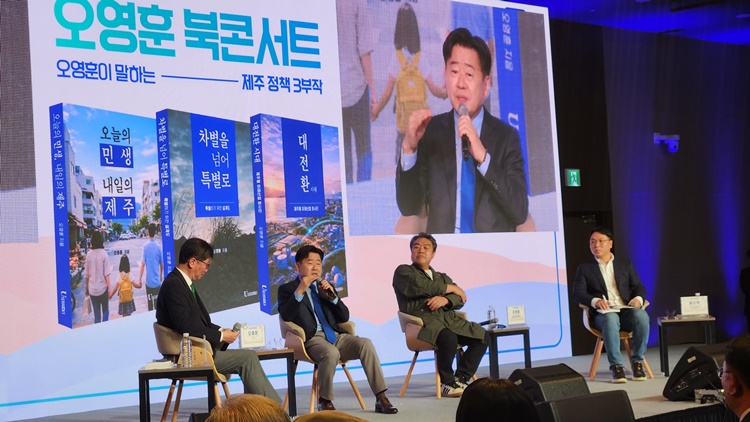 [한라일보] 6·3지방선거에서 재선을 노리는 오영훈 제주도지사가 2일 한라컨벤션센터에서 '차별을 넘어 특별로', '오늘의 민생, 내일의 제주', '대전환의 시대 : 제주형 미래산업 청사진' 제목의 에세이 시리즈(총 3권) 발간에 따른 출판 기념 토크콘서트를 개최했다.