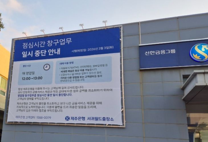 제주은행 3개 점포 '점심시간 휴무제' 시범운영