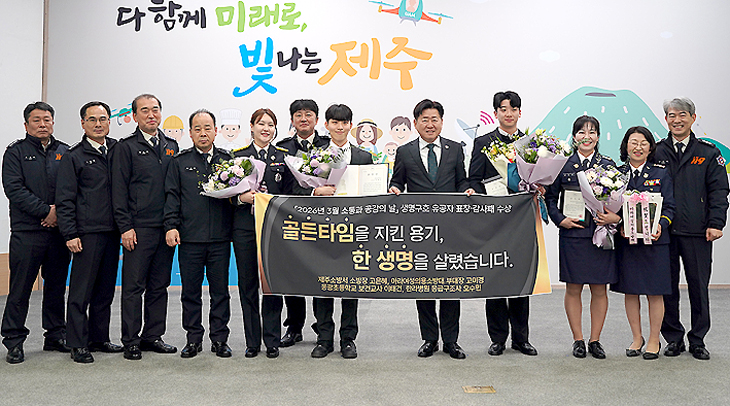 [한라일보] 제주시내 한 체육관에서 발생한 심정지 환자를 구한 구급 유공자 5명이 제주특별자치도지사 표창 및 감사패를 받았다.