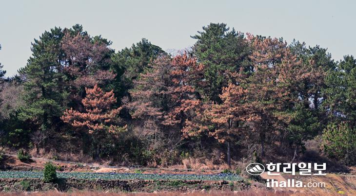 [한라일보] 4일 제주시 한경면 용수리 농경지 인근 야산에 식재된 소나무들이 누렇게 말라 죽어 있다. 강희만 기자