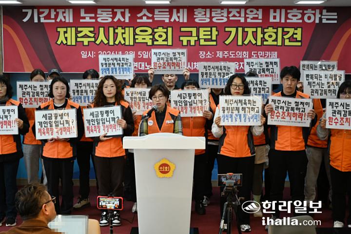 5일 공공연대노조 제주본부 제주시체육회생활체육지부가 제주시체육회 규탄 기자회견을 하고 있다. 강희만기자