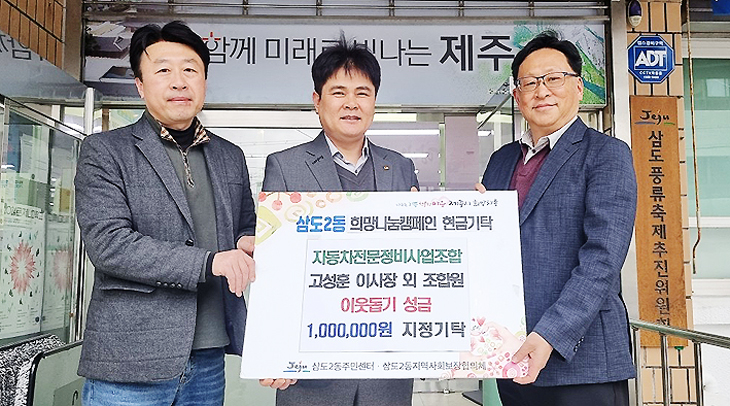 제주특별자치도 자동차전문정비사업조합(이사장 고성훈)은 지난 3일 제주시 삼도2동주민센터(동장 문석훈)에 이웃돕기 성금 100만원을 기탁했다.