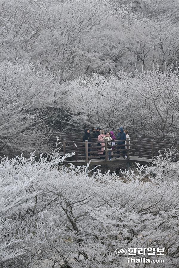 봄을 재촉하는 비가 그친 후 찬 공기가 내려오면서 제주 산간지역에서 눈이 내려쌓이자 관광객들이 설경을 만끽하고 있다. 한라산 1100고지에서 강희만 기자