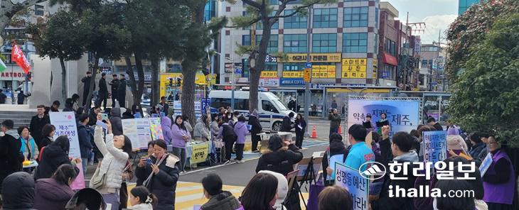 지난 7일 제주시청 일대에서 세계 여성의 날을 기념해 열린 제주지역 여성대회에서 선언문 낭독이 이뤄지고 있다. 박소정기자
