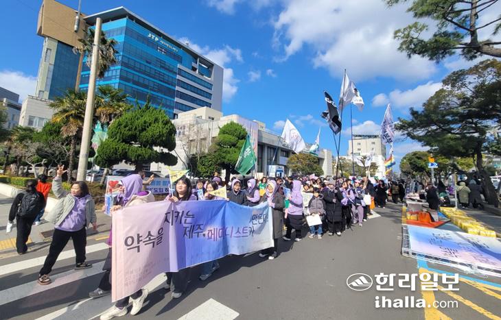 지난 7일 제주시청 일대에서 세계 여성의 날(3월 8일)을 기념해 열린 제주지역 여성대회에서 참가자들이 거리행진에 나서고 있다. 박소정기자