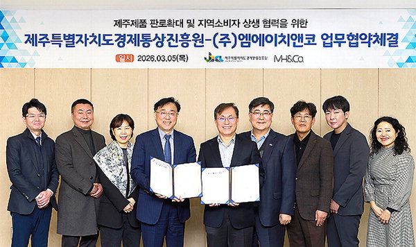 [한라일보] 제주도경제통상진흥원(원장 고병기)은 지난 5일 (주)엠에이치앤코(대표 주종의)와 제주기업 제품의 유통채널 확대 및 상호 협력을 위한 업무협약을 체결했다.