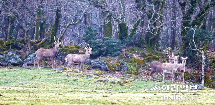 [한라일보] 9일 제주시 용강동 제주마방목장에 외래 침입종인 꽃사슴들이 찾아와 여유롭게 풀을 뜯어 먹고 있다. 강희만기자