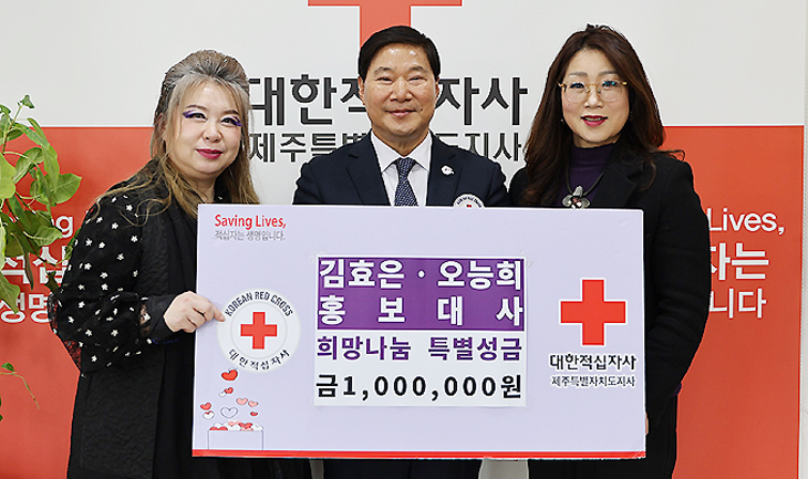 대한적십자사 제주특별자치도지사(회장 정태근) 홍보대사인 김효은 캘리그래피 작가와 오능희 성악가는 최근 적십자사에 희망나눔 특별성금 100만원을 기탁했다.
