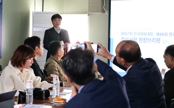 서귀포시가 오는 9~10월 제주에서 열리는 전국체전과 장애인체전을 앞둬 12일 강창학체육공원에서 현장 기자간담회를 갖고 양대 체전의 성공 개최를 위한 시설 준비사항, 안전관리 대책 등에 대해 설명하고 있다. 서귀포시 제공