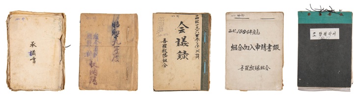 오라 공동목장조합 문서철. 왼쪽부터 승낙서·수납부·회의록·조합가입신청서·조합원각서철. '오라 공동목장조합 문서' 수록 이미지.