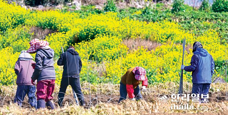 서귀포시 대정읍 하모리 한 농경지에서 파종 작업을 하는 농민들. 한라일보DB
