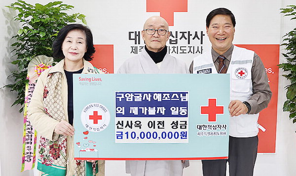 [한라일보] 구암굴사(주지 해조스님)는 최근 대한적십자사 제주도지사에 신사옥 이전 성금 1000만원을 기탁했다. 이번 성금은 해조스님과 재가불자들이 뜻을 모아 마련됐다.