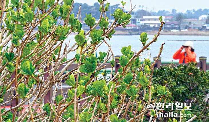 [한라일보] 16일 제주시 구좌읍 해안도로변 수국나무에 초록색 새싹이 돋아나 봄 소식을 전해 주고 있다. 강희만기자