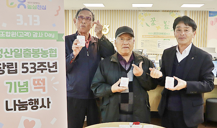 성산일출봉농협(조합장 박명종)은 지난 13일 창립 53주년을 맞아 본·지점과 경제사업소 11개소에서 백설기데이(14일)와 연계한 '조합원·고객 감사 Day' 떡 나눔 행사를 마련, 내방 고객들에게 하트꿀설기 2000여 개를 나누며 감사의 마음을 전했다. 또 이달 새롭게 개설한 성산일출봉농협 카카오톡 공식 채널을 통해 퀴즈 댓글 이벤트도 하루 동안 진행했다.