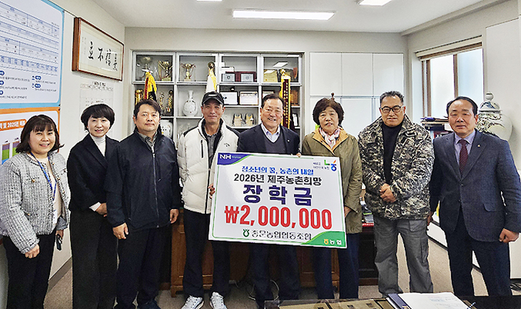 중문농협(조합장 김성범)은 지난 10일 조합장실에서 농촌지역 다문화가정과 조손가정 학생들의 꿈과 희망을 응원하기 위한 '2026년 제주 농촌 희망 장학금 전달식'을 개최했다. 농협재단의 후원으로 마련된 장학금은 농촌지역 다문화가정과 조손가정 학생들의 교육기회 확대와 안정적인 학업환경 조성 지원을 위해 전달됐다.