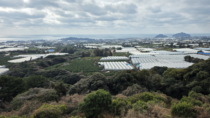 정상은 과수원으로 조성된 지 이미 오래돼 감귤나무가 무성하다. 한 모퉁이 주변에 제주도 재래 감귤인 당유자나무가 서 있는데 높이가 4~5m, 나무 굵기 30~40㎝로 수령이 50년은 충분해 보인다. 열매는 직경 10~15㎝ 정도로 큼직하다. 오름의 정상이란 항상 바람이 세서 농사가 안되는 게 일반적이다. 그러나 이 오름은 정상부가 다소 불룩하긴 하지만 전체적으로 평탄하다. 주위에 조성된 삼나무 가로수의 영향도 크겠지만 이런 완만하게 평탄한 오름의 지형이 강한 바람 피해를 줄여주는 요인이 될 것 같다.