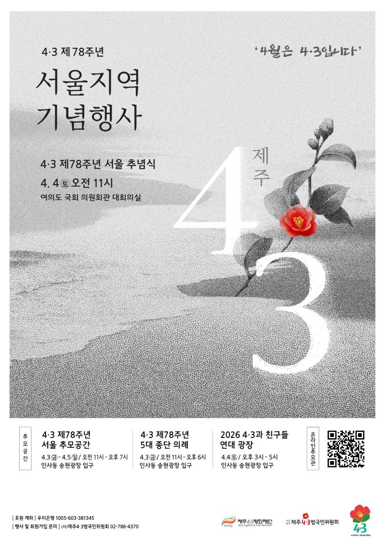 (사)제주4·3범국민위원회는 17일 4·3 제78주년 서울 추념식을 오는 4월 4일 오전 11시부터 서울 여의도 국회 의원회관 대회의실에서 개최한다고 밝혔다.
