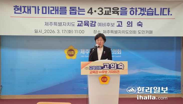 제주도교육감 선거에 출마한 고의숙 예비후보가 17일 제주도의회 도민카페에서 기자회견을 열고 제주도교육청에 '제주4·3교육과'를 신설하겠다고 공약하고 있다. 김지은기자