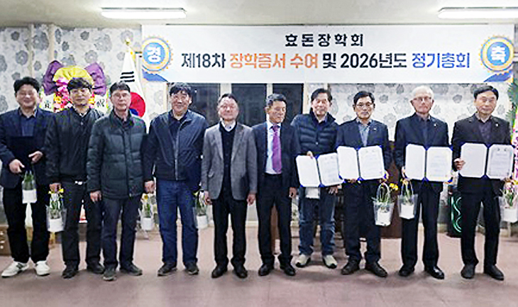서귀포시 효돈장학회(이사장 김도삼)는 지난 15일 회원 50여 명이 참석한 가운데 제18차 장학증서 수여 및 2026년 정기총회를 개최했다. 효돈장학회는 대학생 3명에게 각 100만원씩 장학금 300만원을 전달하는 한편 정기총회에서는 2025년도 결산 및 2026년 사업계획과 예산을 심의했다. 또 신규 회원으로 가입한 장학회원 23명에게 효돈장학회원 인증서를 전수했다.