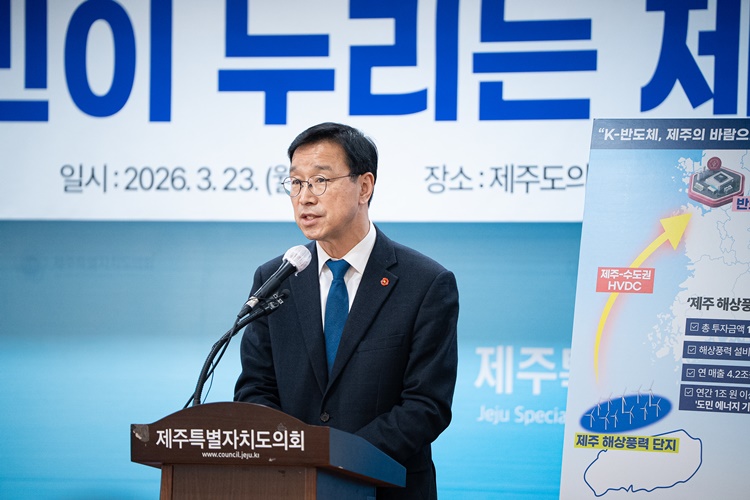 위 의원은 23일 제주도의회 도민카페에서 기자회견을 열고 "제주의 보물인 '바람'을 통해 제주의 경제 지도를 바꾸고 도민이 결실을 누리는 '에너지 주권 시대'를 선포하고자 이 자리에 섰다"고 밝혔다.