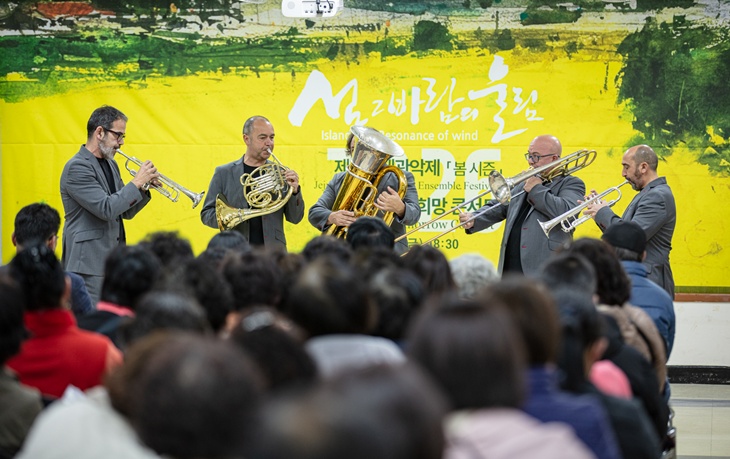제주국제관악제 봄 시즌 프로그램으로 진행된 스페니쉬 브라스의 동려평생학교 공연. 제주국제관악제조직위 제공