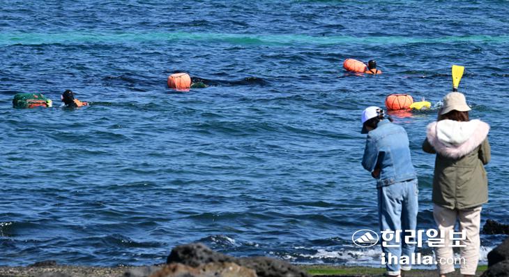 해녀 물질 지켜보는 관광객들